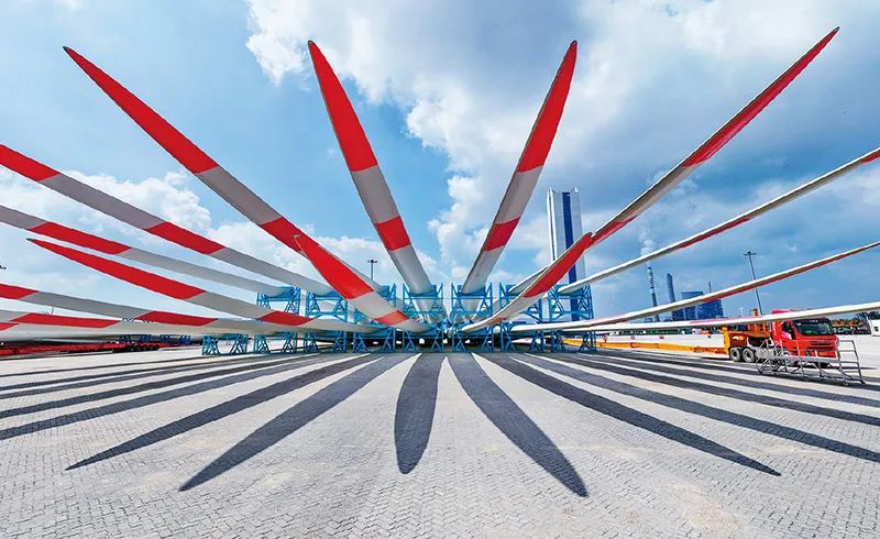 綠色低碳是新型工業化的生態底色。近年來,我國穩妥有序推進工業綠色低碳轉型,積極打造綠色產業集群,努力讓綠色成為高質量發展的鮮明底色。圖為2023年9月8日,一批風電葉片在江蘇省鹽城港射陽港區碼頭等待運輸。 新華社記者 李博/攝