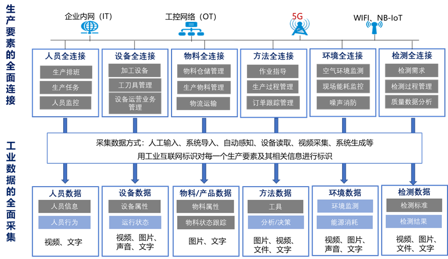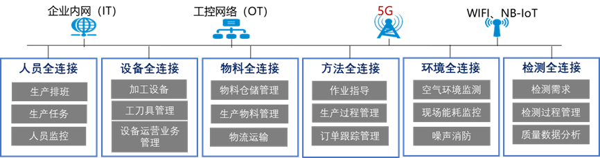 圖1:5G全連接工廠人、機(jī)、料、法、環(huán)、測等聯(lián)網(wǎng)內(nèi)容示例