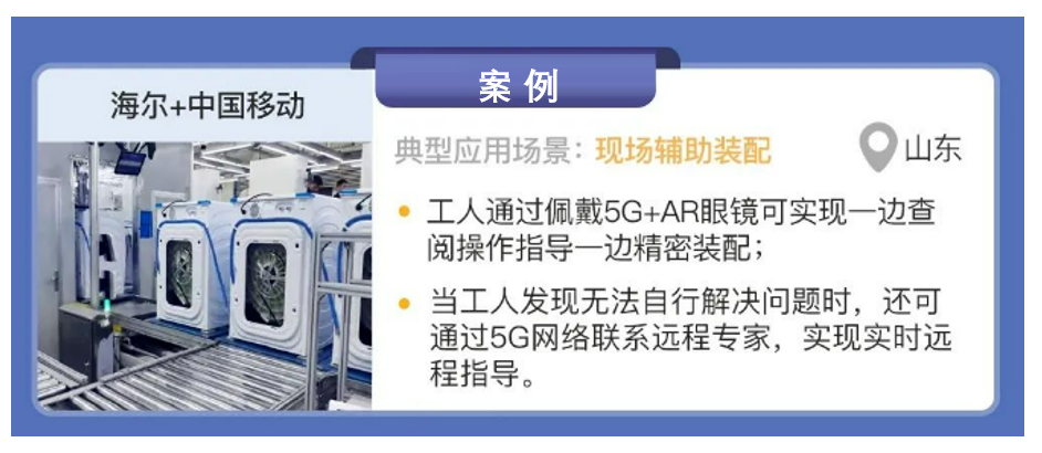 海爾與中國移動合作,在山東省青島市利用5G技術實現了精密工業裝備的現場輔助裝配場景的應用。青島海爾家電工廠結合海爾卡奧斯工業互聯網平臺,打造基于5G+MEC 的互聯工廠,開展了基于AR 眼鏡的5G遠程輔助裝配,工人通過佩戴 AR 眼鏡采集關鍵工業裝備的現場視頻,同時從后臺系統調取產品安裝指導推送到AR眼鏡上,實現了一邊查閱操作指導一邊裝配的目的。當工人發現無法自行 9 解決問題時,還可以通過 5G 網絡聯系遠程專家,實現實時遠程指導。另外,通過將算力部署在MEC 側,降低了AR眼鏡算力要求與眼鏡重量,實現數據的本地計算,保障視頻數據不出園區,一方面解決了以往Wi-Fi 連接產生的信號不穩定、暈眩感和 AR 眼鏡偏重的困擾,另一方面也節省了維修時間和成本。