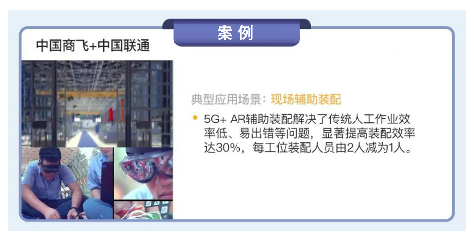 中國商飛與中國聯通合作,在上海浦東新區開展了“5G+工業互聯網賦能大飛機智能制造”項目建設,搭建了 5 座宏基站和 150 余套室分小站,實現了現場輔助裝配場景的應用。在現場輔助裝配方面,商飛在裝配車間中存在大量飛機線纜連接器裝配工作的工位,通過引入 5G+AR 輔助裝配系統,工人利用AR虛擬信息實現虛實疊加,根據顯示的指導畫面完成裝配操作。通過 5G 高速率和低時延特性,讓工人準確、快速地對 12 線纜連接器進行查找和裝配,并保障數據的有效性,解決了傳統人工作業效率低、容易出錯等問題,顯著提高了裝配效率達 30%,每工位所需裝配人員由2 人減少為1 人。