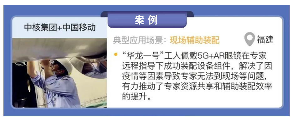 中核集團與中國移動合作,在福建省福清開展5G+核電項目建設,實現了現場輔助裝配場景的應用。在“華龍一號”六號機組的裝配建設現場,通過5G專網+AR等技術,工人佩戴 AR 眼鏡在專家遠程指導下成功裝配設備組件,解決了因疫情等因素導致專家無法到現場等問題,有力推動了專家資源共享和輔助裝配效率的提升。