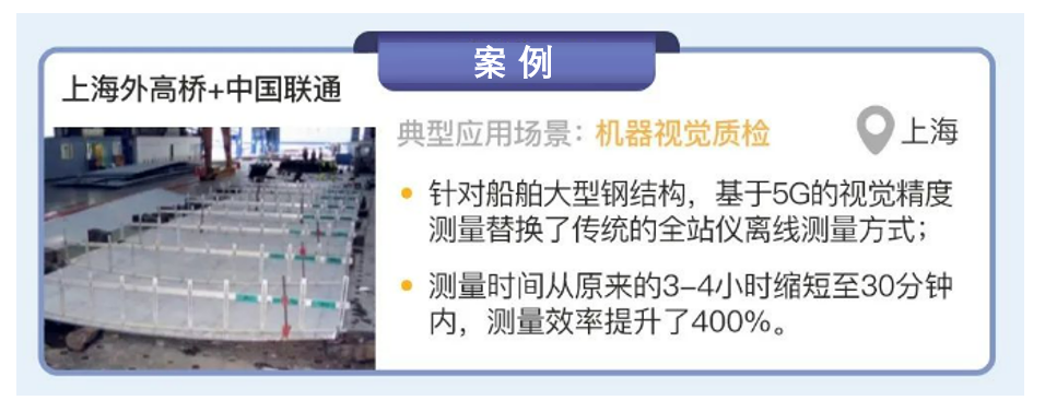 上海市外高橋造船有限公司與中國聯通合作,在上海市開展“5G+工業互聯網”在船舶行業的落地應用,搭建 5G 專網,融合 MEC 技術,實現了基于5G的機器視覺檢測場景的應用。使用工業相機+靶點的測量模式進行大型鋼結構精度測量,通過 5G 專網及邊緣云,實時回傳、解算現場拍攝圖片,生成點位文件。基于5G 的視覺精度測量替換了傳統的全站儀離線測量方式,將測量時間從原來的3-4小時,縮短至 30 分鐘內,測量效率提升了400%。