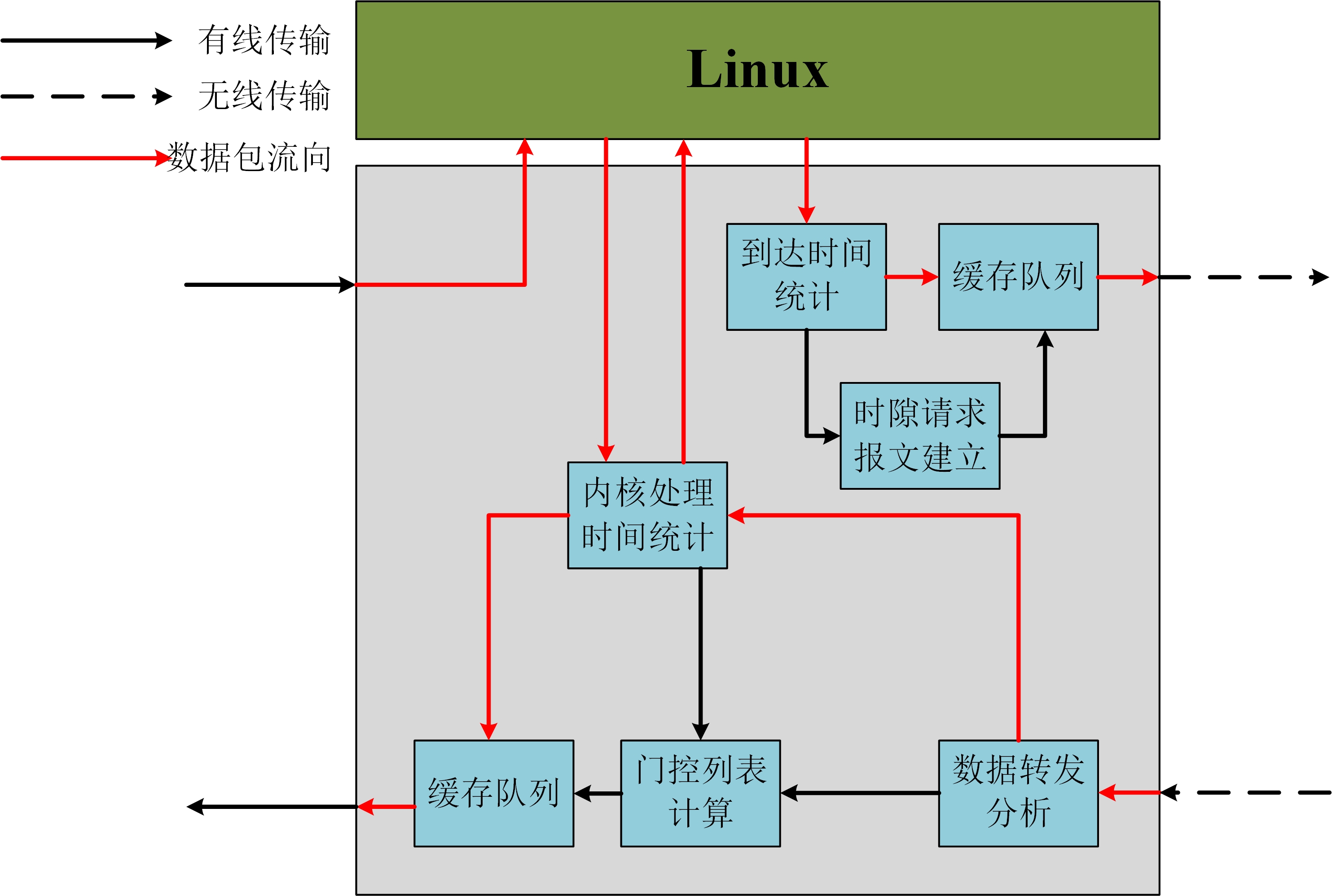 面向PLC云化部署的TSN交換機開發:在工業互聯網領域中,業務流量模型相比傳統工業控制網絡的流量更為復雜,即從單一的產線內部的控制流量,轉變為產線內部、產線之間、控制網絡與信息網絡之間的多種業務流量類型并存。有線無線融合傳輸節點需要完成不同鏈路類型之間的數據轉換,模塊中的數據流向與子模塊功能如下圖所示。數據需要通過有線無線融合鏈路進行傳輸,數據在有線鏈路傳輸至無線輸出端口時,各節點的無線數據發送時刻由時隙分配算法的計算結果所決定。在每個有線無線融合傳輸節點中的重要模塊有:數據轉發分析模塊、門控列表計算模塊。通過通用硬件平臺和