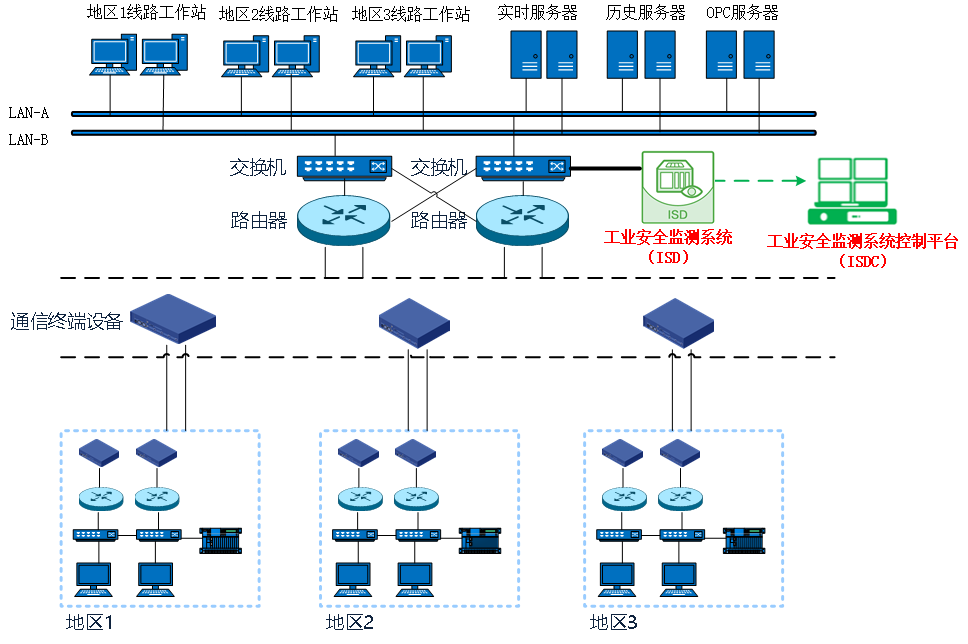 通過前期調(diào)研了解到,各廠站端的工業(yè)流量匯聚到分控中心。為能夠?qū)崟r采集流量、不影響現(xiàn)有工業(yè)網(wǎng)絡(luò),采取了在交換機(jī)旁路部署工業(yè)安全監(jiān)測系統(tǒng)(ISD)進(jìn)行安全監(jiān)測,在分控中心采用工業(yè)安全監(jiān)測控制平臺(ISDC)進(jìn)行整體態(tài)勢感知的解決方案。