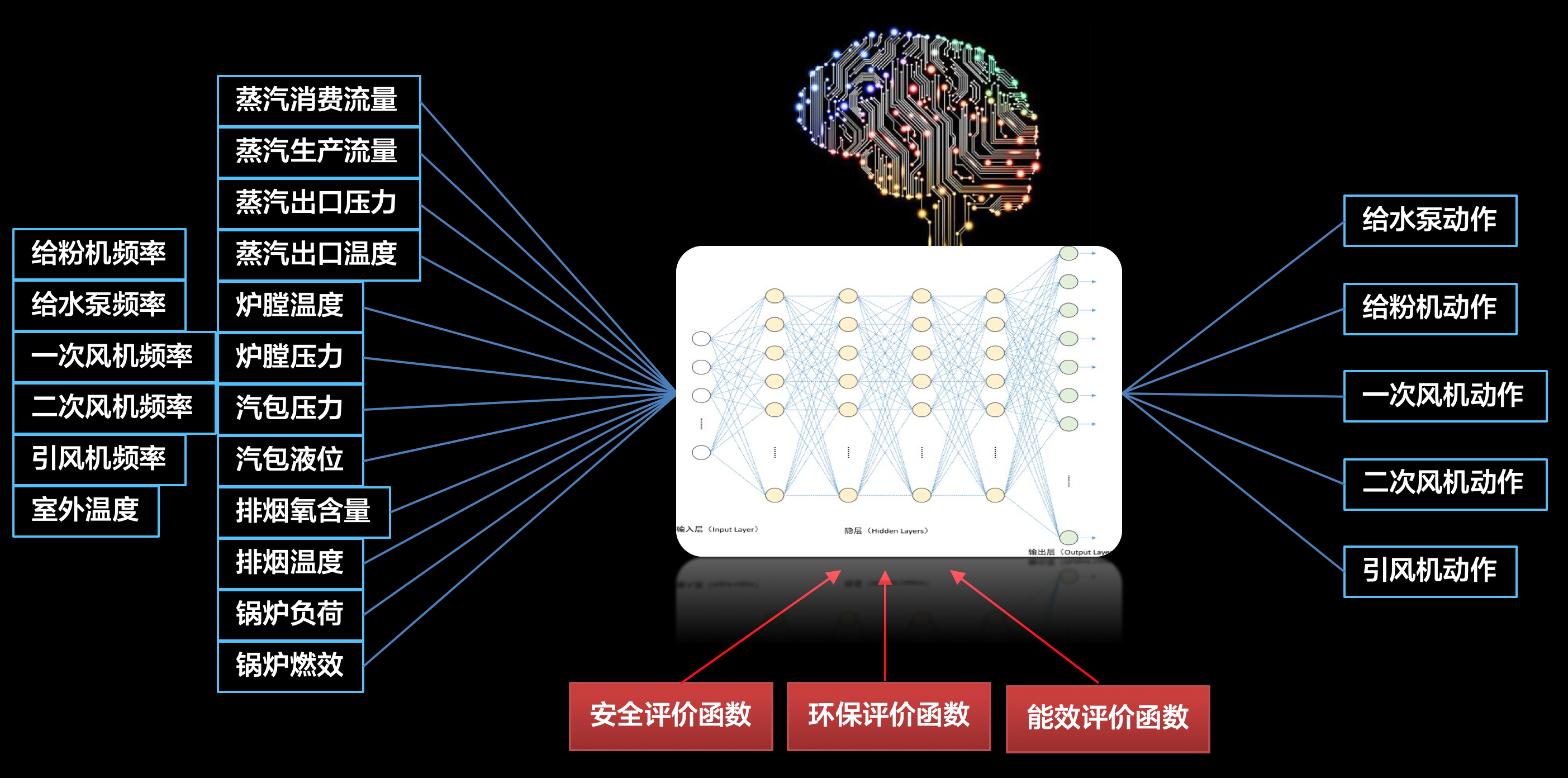 基于熱能生產關鍵生產工藝過程的歷史運行數據,對給粉機、鍋爐、管網等建立數字孿生和數據模型,能夠通過模型實時對最佳鍋爐參數進行預測,為司爐人員提供最優的操作建議,對各種鍋爐控制進行實時最優化調整,包括:給粉機運行數量、給粉機頻率、一次風機頻率、二次風機頻率、引風機頻率、給水泵頻率、減溫減壓水開度等。如下圖是基于深度學習的鍋爐控制模型: