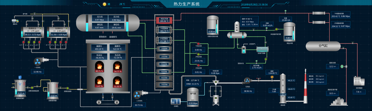 生產系統監控應該能夠提供對整個生產工藝過程的實時在線查看;能夠以組態圖的形式對化水的超濾、反滲透、混床,燃燒的水系統、鍋爐系統,環保的除塵、脫硫、脫銷等工藝過程展示重要參數的實時指標,同時能夠以曲線的形式展示各項生產數據的實時趨勢和歷史變化過程。如下圖所示: