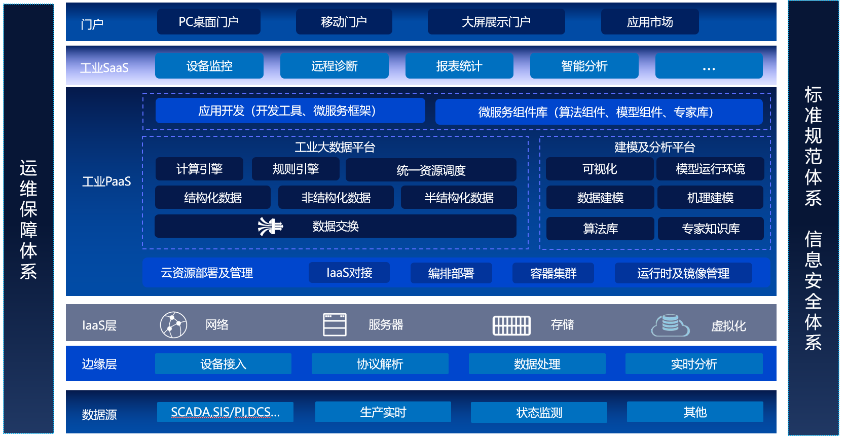 國網新源水電主設備實時分析監測系統采用分布式、多層體系架構,自頂向下分為展示層、業務應用層、平臺層、基礎層、接入層(采集層),建立在統一的標準規范體系、安全管理體系、運維保障體系下。