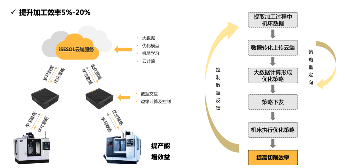 iSESOL 智能增效應(yīng)用在不改變原有機床加工程序的基礎(chǔ)上,通過智能化的算法識別與學習,生成基于該工況下唯一的優(yōu)化策略,通過該策略指導后續(xù)加工過程,對機床進行智能化調(diào)控,能夠提升機床加工效率平均達10%以上。通過預設(shè)的人機交互界面,終端用戶可以對設(shè)備運行的多種環(huán)境因素進行錄入,同時再結(jié)合實時的數(shù)據(jù)采集、學習和控制結(jié)果反饋,對優(yōu)化策略不斷進行歸集和調(diào)整。