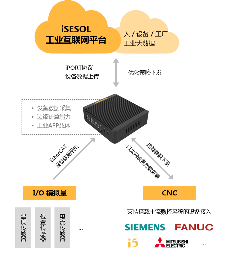 智能云科信息科技有限公司自主研發(fā)的邊緣計算網(wǎng)關(guān)——iSESOL BOX,具備工業(yè)協(xié)議適配、工業(yè)現(xiàn)場設(shè)備數(shù)據(jù)采集與邊緣計算能力,結(jié)合iSESOL工業(yè)互聯(lián)網(wǎng)平臺的云服務(wù)產(chǎn)品,形成“云+邊緣”的工業(yè)互聯(lián)網(wǎng)技術(shù)架構(gòu)及服務(wù)能力,為機加工企業(yè)提供設(shè)備狀態(tài)監(jiān)控、生產(chǎn)效率提升及設(shè)備全生命周期維護等能力支撐。