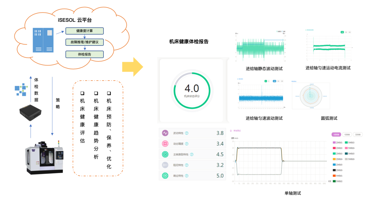 圖4 iSESOL 機床體檢應(yīng)用模式及報告展示示意圖