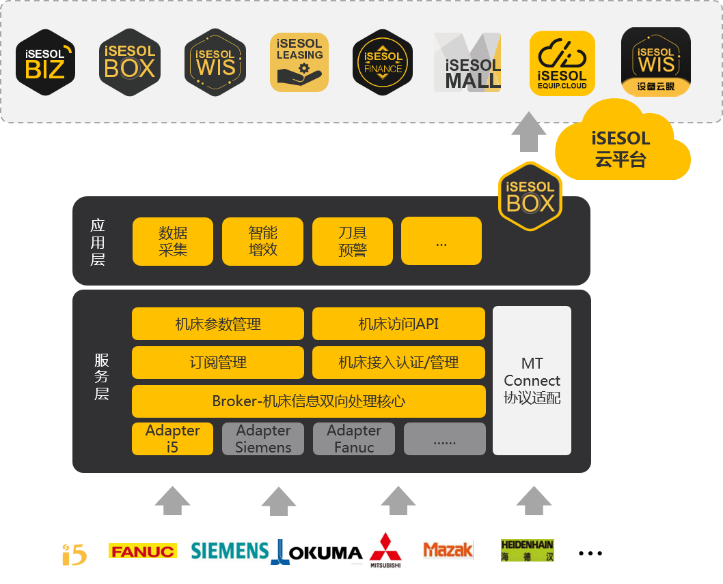 智能云科基于iSESOL BOX的數(shù)據(jù)集成能力,結(jié)合iSESOL工業(yè)互聯(lián)網(wǎng)平臺的云服務(wù),為用戶提供在線產(chǎn)能交易、裝備全生命周期數(shù)據(jù)管理、工業(yè)APP等高附加值產(chǎn)品和服務(wù)。