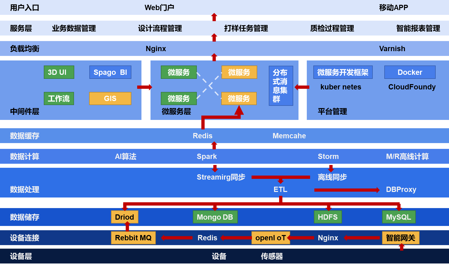 數(shù)網(wǎng)星印刷行業(yè)智能試制APP采用B/S架構(gòu),分為數(shù)據(jù)層(數(shù)據(jù)采集層、數(shù)據(jù)庫層)、業(yè)務(wù)邏輯層(通用應(yīng)用平臺層、通用業(yè)務(wù)層)、數(shù)據(jù)展現(xiàn)層(服務(wù)器端,移動端)、各層之間職責(zé)明確、數(shù)據(jù)統(tǒng)一管理,系統(tǒng)具備擴充性。技術(shù)結(jié)構(gòu)大致可以定義為:客戶機層上的表示層主要是通過微服務(wù)框架實現(xiàn)的,由顯示視圖產(chǎn)生一個請求。請求被Controller(控制器)接收,它在Controller類中標有RequestMapping注解的方法中尋找請求的URI,并在此方法中執(zhí)行相應(yīng)的業(yè)務(wù)邏輯,在執(zhí)行完業(yè)務(wù)邏輯后根據(jù)返回值確定展示數(shù)據(jù)的視圖。