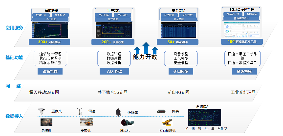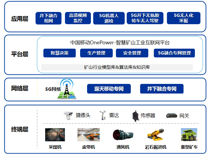 智慧礦山是基于現代智能化理念,將工業互聯網、云計算、大數據等與現代礦山開發技術深度融合,形成礦山全面感知、實時互聯、分析決策、自主學習、動態預測、協同控制的完整智能系統,實現礦井開拓、采掘、運通、分選、安全保障、生態保護、生產管理等全過程的智能化運行。5G網絡以其大帶寬、低時延、廣連接的特性與礦山領域數據采集及智能控制的場景契合度非常高,是打造智慧礦山的基礎條件。中移(上海)產業研究院基于自身技術創新能力及行業經驗積累,自主研發智慧礦山融合管控平臺(中國移動礦山工業互聯網平臺),平臺打造智慧決策、生產管理、安全管理、移動應用等功能模塊,打通專業子系統之間的數據通道,為行業客戶實現綜合管控、數字化運維提供使能。同時結合5G技術優勢,為行業客戶提供端到端一體化智慧礦山服務。