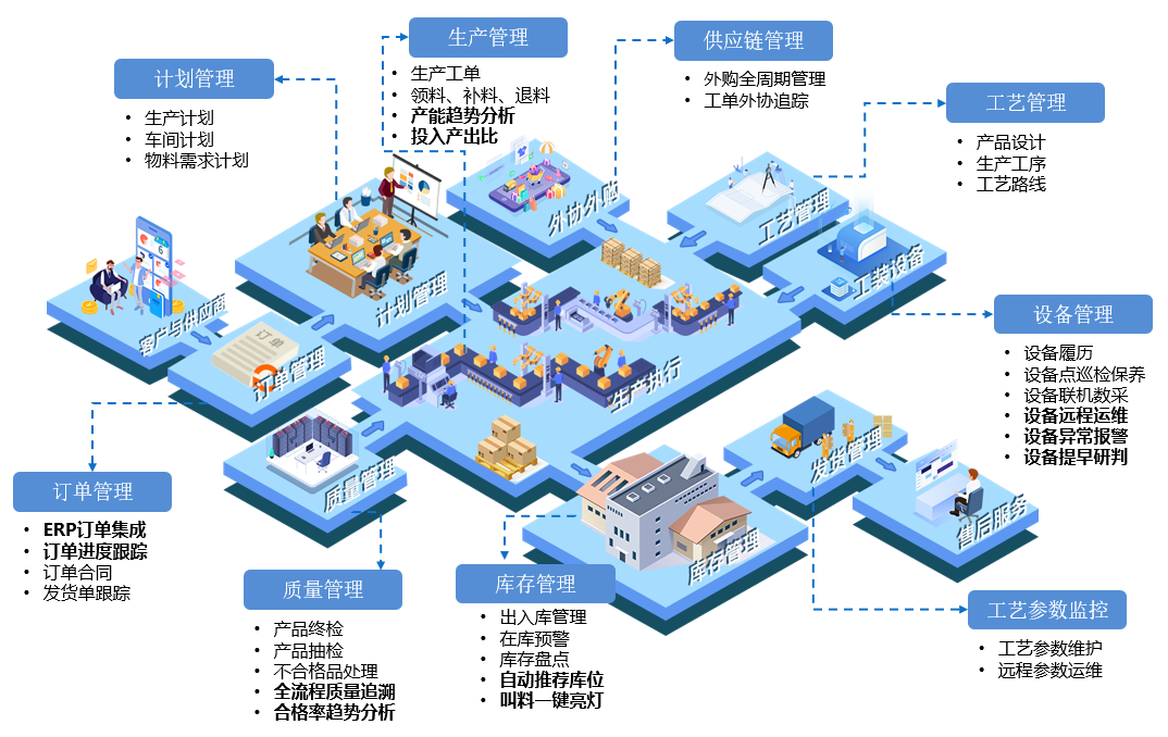 6.生產(chǎn)過程數(shù)字化:實現(xiàn)質(zhì)量檢驗、生產(chǎn)報工、產(chǎn)品工序轉(zhuǎn)移、在制品管理、不合格管理。