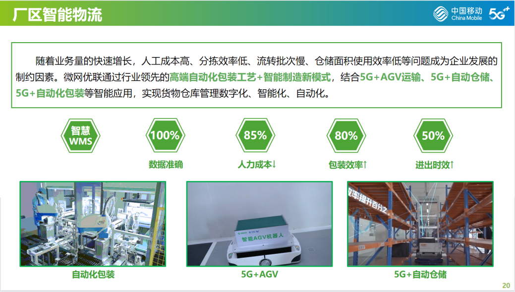 通過5G改造,賦能5G+專網全覆蓋、5G+生產現場監測、5G+廠區智能物流、5G+生產過程溯源、5G+工業視覺質檢、5G+VR示教、5G+云端異地協同辦公等多種典型5G應用場景,形成5G應用最全,連接廣泛的“5G+工業互聯網”解決方案,幫助企業提質降本增效。生產效率比傳統工藝提升了40%,產品質檢準確率提升至99.5%以上,設備故障率降低25%以上,產線布線成本降低100余萬元;在5G+智慧倉儲與自動化包裝環節,結合AGV運輸、自動裝箱、發貨等智能應用,數據準確率可達100%,包裝效率提高80%,進出時效提高50%,同時降低了85%人力成本。
