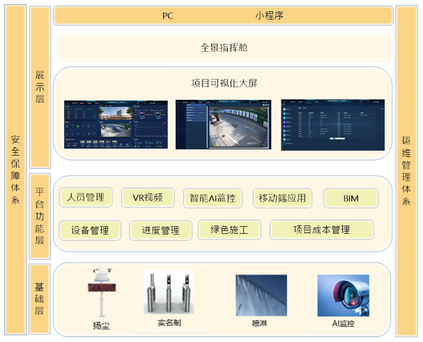 該項目從工地實際業務需求出發進行頂層設計、系統規劃,充分考慮業務數據的共通性、串聯性,整體架構分為基礎數據層、平臺功能層、前端展示層: