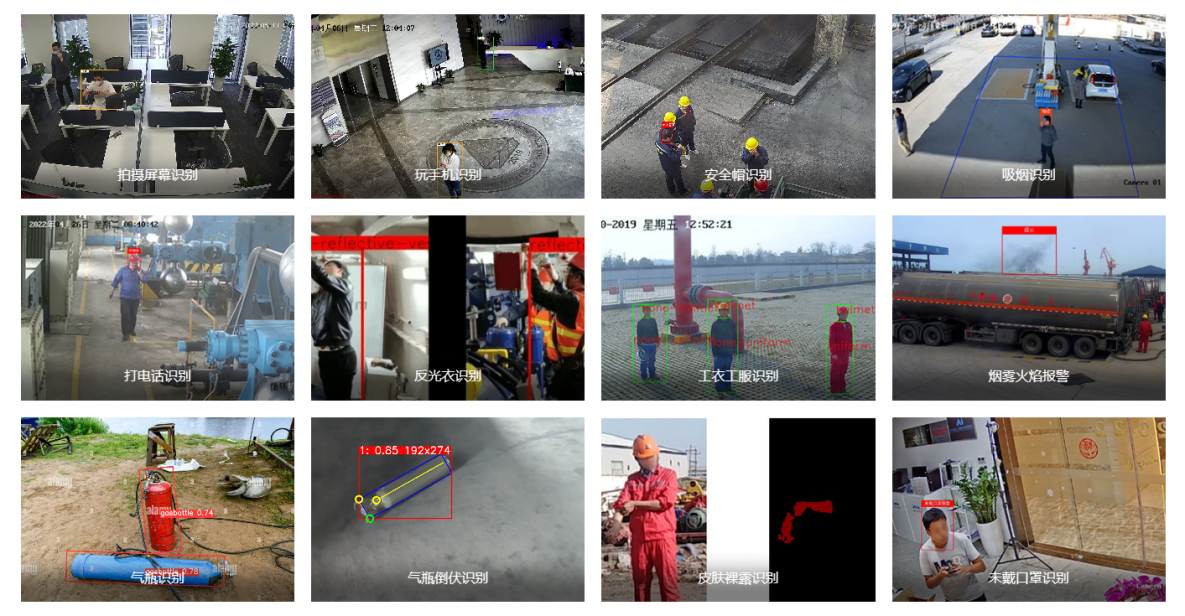 該項目針對工地人員管理需求,及各種違規操作和不文明施工現象,提供包括安全帽識別、反光背心識別、煙霧火焰識別、人員闖入識別等常見算法,以及未穿工服識別、離崗識別、抽煙識別、打電話識別、裸土識別、皮膚裸露識別、車輛噴淋識別等多種可拓展的行業特殊算法。