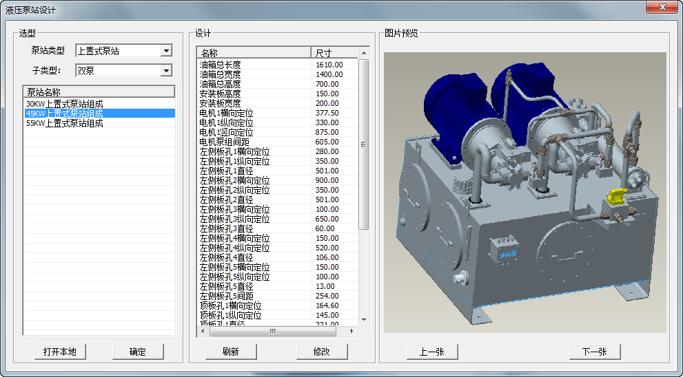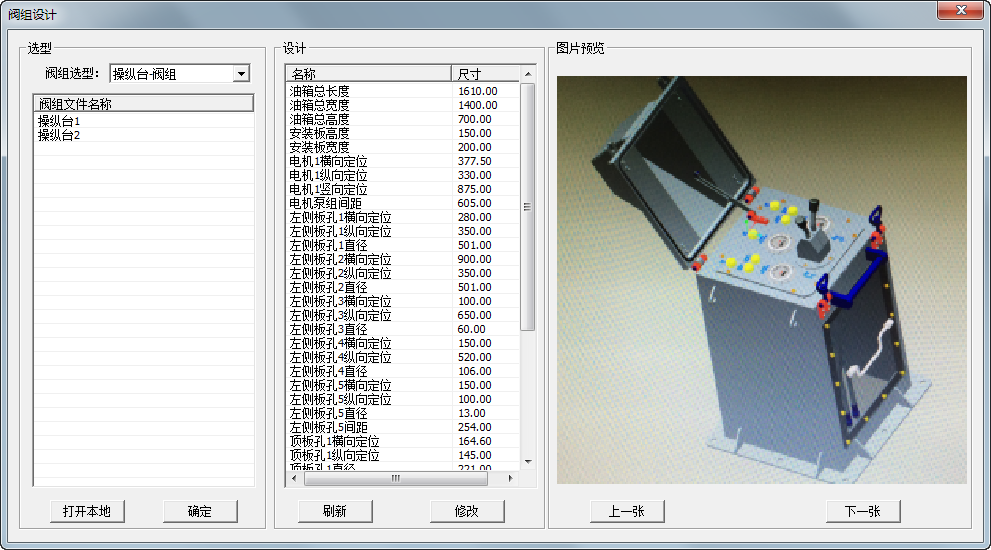 在“閥組選型”中可選擇當前定義的泵站結構,目前有“操縱臺-閥組”、“馬達-閥組”與“支架-閥組”,類型可擴展;在“閥組文件名稱”列表中,可選擇當前類型下的所有閥組種類。