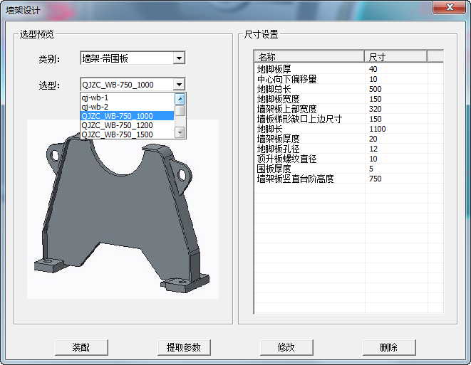 在“底座類型”中,可通過下拉菜單選擇需要的底座模型,下方為圖片預覽。可通過此尺寸列表,修改模型中的相關尺寸信息,具體操作方式為:點擊“提取參數”在模型樹中選擇底座總成選擇完成后將會在此表中將模型中可調整的參數顯示出來修改尺寸信息在功能按鈕區域點擊“修改”,通過此流程將可以修改相關尺寸信息。