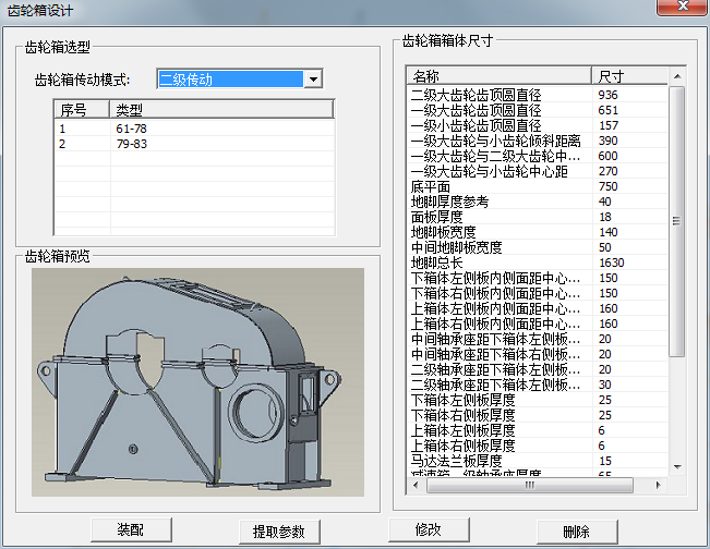 在選型界面可選擇需要的齒輪罩類型,類型可擴展??赏ㄟ^“提取參數”功能,將當前模型中的數據提取到尺寸設計表中,可自定義相關尺寸,點擊“修改”可將當前值傳遞到模型。