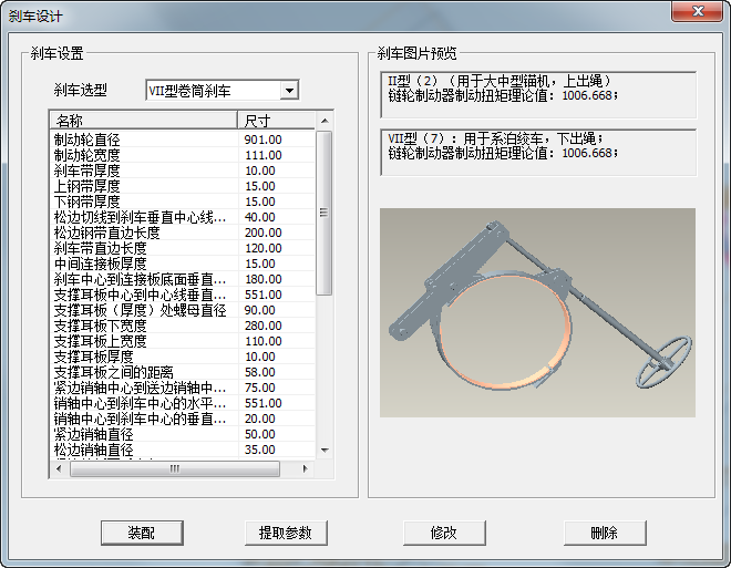 在剎車設置對話框下,首先是剎車選型,其中包含當前定制的剎車選型結構,可擴展。在剎車選型下方是參數界面,可對相關參數進行微調,點擊“修改”,可將當前參數信息傳遞到模型中并更新模型。
