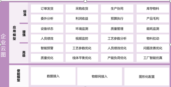 APP具備從業務應用場景出發的應用模型和用于數據接入與處理的使能模型。數據接入廣泛支持各類設備及信息系統;數據展現具備豐富圖形組,支持自定義;應用模型包含智能的交付、物流、生產、監控、質量、設備管理等板塊,支持工廠運行規則的重用與繼承擴展,且支持多級數據監測策略與預測模型配置。