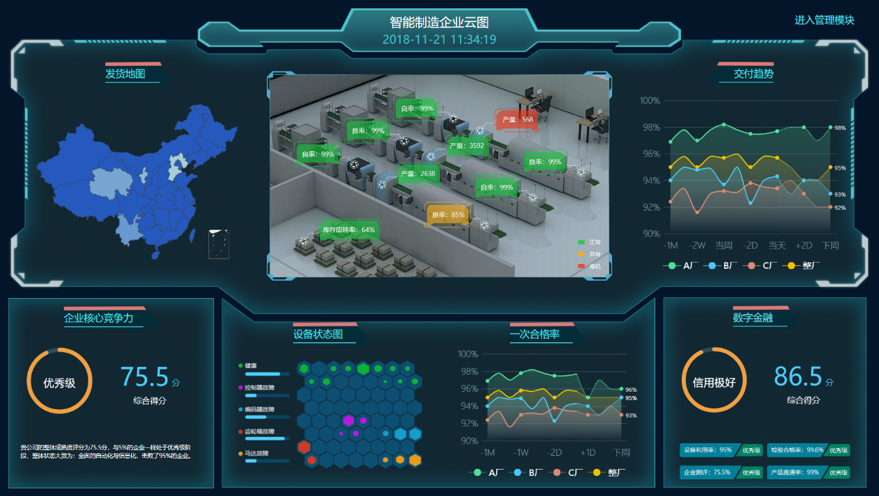 “關于企業訂單情況,有多少訂單在生產,質量問題能否實時追溯?企業生產情況如何,哪些設備在工作,設備稼動率如何?關于人員情況,員工的工作績效怎么樣?”以上問題很多企業管理者都無法立刻給出答案,原因在于很多企業還是傳統的生產經營方式,缺乏統一抓手, 無法實現隨時隨地掌握生產經營狀態。企業云圖依托紫光工業互聯網平臺能力,基于卓越的精益經營理念,幫助客戶快速建立動態企業畫像, 通過數據分析預測企業未來畫像,打造數字化智能工廠門戶,幫助企業隨時隨地掌握生產經營狀態,提升企業核心能力,實現可持續改善。