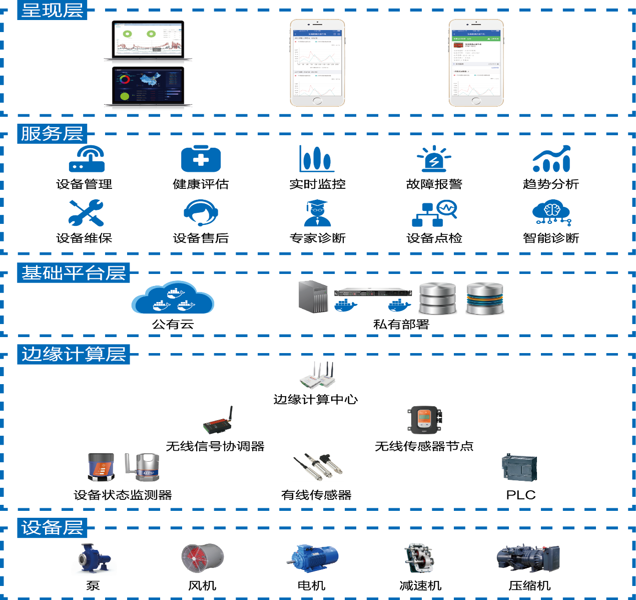 服務層:包含數據分析平臺、應用服務層。通過數據分析對采集到的監測數據進行存儲、建模、挖掘、分析,實現關鍵設備監測數據的歷史分析、多維度分析、頻譜分析、故障預報、預警等。
