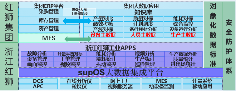 方案采用supOS平臺作為紅獅集團各個分廠的生產管控平臺,以ERP、MES、EAM的基礎數據作為主數據,搭建多維度的工廠模型,對接ERP的人員、組織、崗位,EAM的設備、附屬設備、備品備件及MES的生產、質量以及能耗等基礎數據,并對廠區的DCS、PLC、視頻及各個智能儀表、儀器進行數據實時采集。融合多維工廠模型框架黏附工廠在生產管理過程中產生的業務數據及生產運行過程中的實時數據,通過機器視覺技術對工廠在生產過程中進行實時監測、分析、預警并作出輔助性決策;通過海量的生產工藝數據及質量數據,利用大數據技術實現對水泥成品強度的預測以及對產品相關質量指標的軟測量;通過專家系統提升余熱發電量,降低生產能耗,達到節能減排增效的目的。