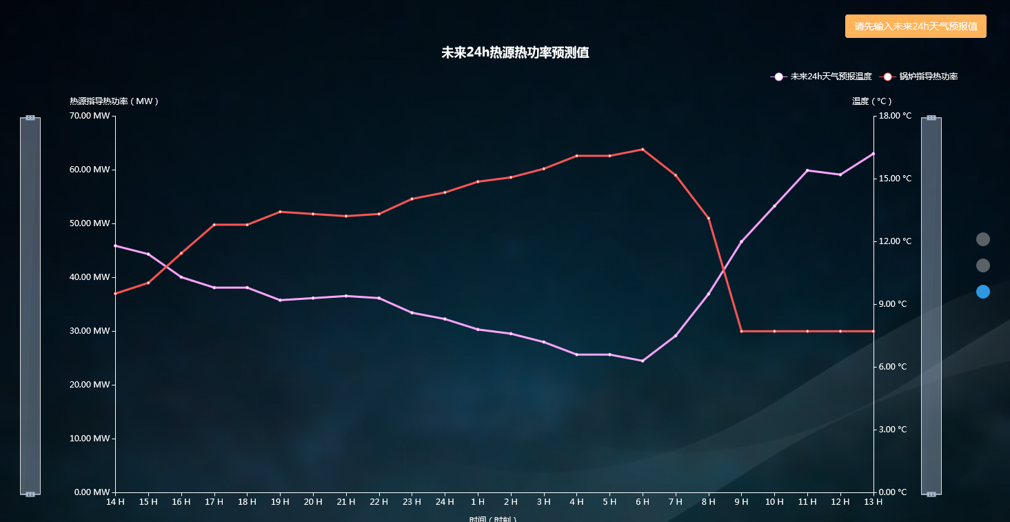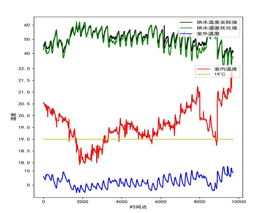 基于大量歷史數據,得出一次網供熱溫度在不同工況下的純延遲與慣性時間。基于熱源機理與數據驅動,建立精確的熱源預測模型,通過該模型得出熱源在室外溫度改變時,預測的熱源功率優化曲線。進而保證合理的供熱量,保證換熱站的熱量供給,如下圖所示。