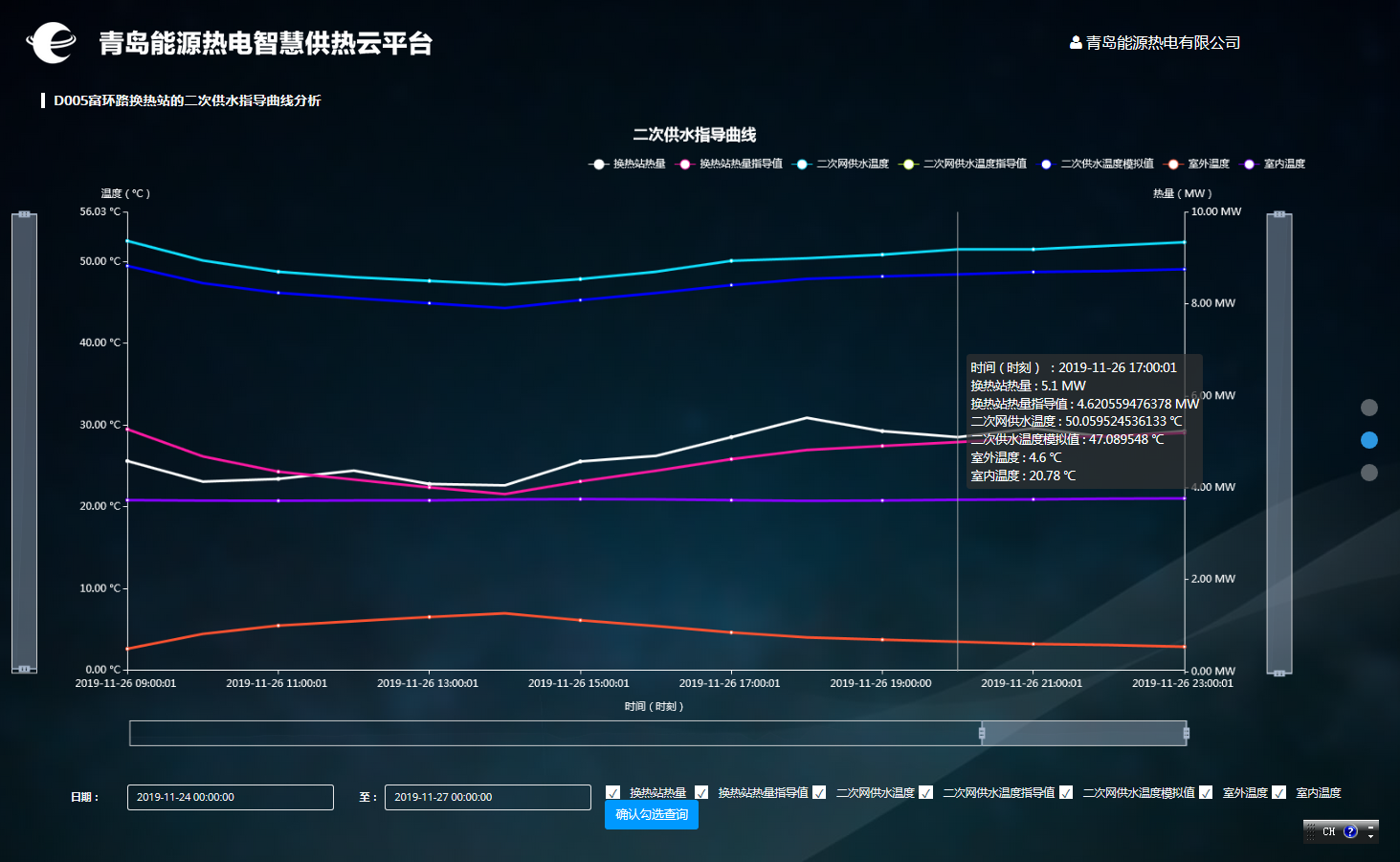 智慧供熱云平臺能夠提供基于專業供熱數據的大數據挖掘與可視化分析展現功能,通過整合熱源、換熱站、管網、氣象、熱用戶數據及客服系統反饋信息,形成全熱網統一的大數據挖掘分析平臺,幫助青島能源熱電有限公司及下屬熱力分公司掌握全熱網供熱各個環節運營狀況及客戶滿意度,通過整合現有粗放、零散、低效的數據資源,實現熱網的統一信息化協調監管,針對性改善服務質量,提供個性化服務,為節能降耗、運營管理和日常運作提供重要指導和支持。