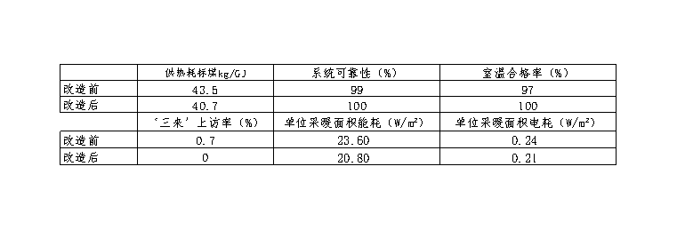 針對30個換熱站,5臺鍋爐,供熱面積348萬平方米,通過模型與大數據結合技術,室溫合格率從97%上升到100%,系統可靠性從99%上升到100%,‘三來’上訪率降至0。在保證用戶室溫合格率的基礎上,單位采暖面積平均能耗由23.6W/m2減少到20.8 W/m2,單位采暖面積電耗由0.24W/m2減少到0.22 W/m2,供電耗標煤由43.5kg/GJ減少到40.7kg/GJ,取得了明顯的經濟效益,如下圖所示。