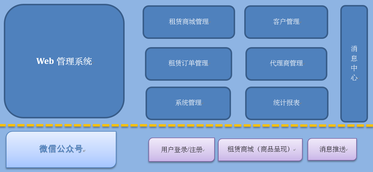 商城包含展示前端和管理后臺兩端;其中終端客戶在商城展示端查看租賃產品信息;平臺運營商和代理商使用管理后臺進行產品管理以及發布;