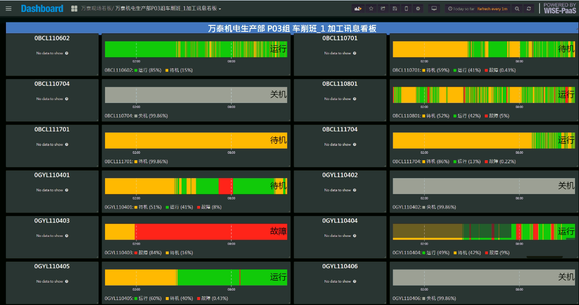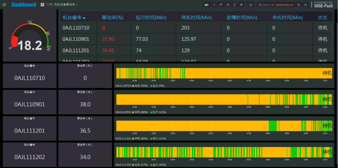 以物聯(lián)網(wǎng)技術(shù)監(jiān)控設(shè)備實(shí)時(shí)狀態(tài)等資訊,通過(guò)研華先進(jìn)的WISE-PaaS智能工廠物聯(lián)網(wǎng)平臺(tái)服務(wù)架構(gòu),結(jié)合標(biāo)桿化KPI管理看板和后臺(tái)數(shù)據(jù)分析,找到數(shù)據(jù)可視化方法,實(shí)現(xiàn)對(duì)機(jī)床生產(chǎn)狀態(tài)、主軸溫度、負(fù)載、刀具信息等基礎(chǔ)數(shù)據(jù)進(jìn)行采集,對(duì)NC程序代碼進(jìn)行上傳和下載。通過(guò)可視化數(shù)據(jù),進(jìn)行設(shè)備綜合效率OEE的評(píng)估、機(jī)床報(bào)警信息統(tǒng)計(jì)分析、磨齒檢測(cè)和了解在制品WIP的分布。通過(guò)一目了然的了解所有機(jī)床狀態(tài)實(shí)時(shí),及時(shí)調(diào)整生產(chǎn)計(jì)劃,提高稼動(dòng)率。