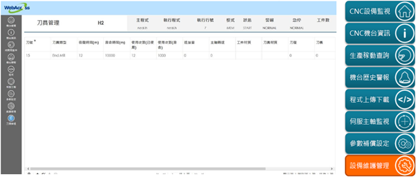 通過(guò)WebAccess/CNC可設(shè)置預(yù)警保養(yǎng)次數(shù),并監(jiān)控刀具的累計(jì)使用次數(shù),在到達(dá)界限值時(shí)及時(shí)預(yù)警通知保養(yǎng),以減少更換時(shí)間,保障生產(chǎn)品質(zhì)。