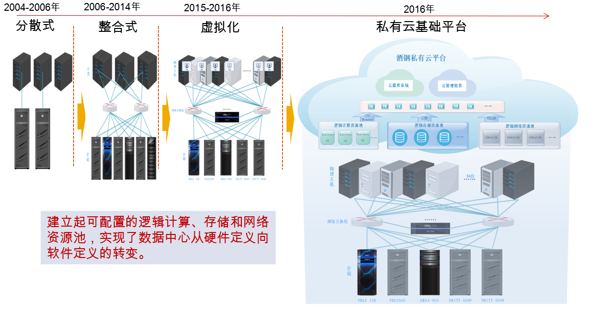 傳統(tǒng)工業(yè)模式與改造后新模式的對比描述 | 酒鋼信息中心依據(jù)云計(jì)算技術(shù)架構(gòu)和發(fā)展趨勢,結(jié)合酒鋼實(shí)際情況,搭建完成甘肅省首家工業(yè)私有云平臺,使得酒鋼數(shù)據(jù)中心真正從傳統(tǒng)數(shù)據(jù)中心轉(zhuǎn)型升級到綠色節(jié)能云數(shù)據(jù)中心。 酒鋼從傳統(tǒng)數(shù)據(jù)中心向云數(shù)據(jù)中心的發(fā)展演變圖如下:
