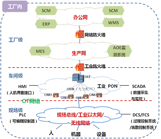 圖2-2 工業PON設備在工廠內網絡中的位置