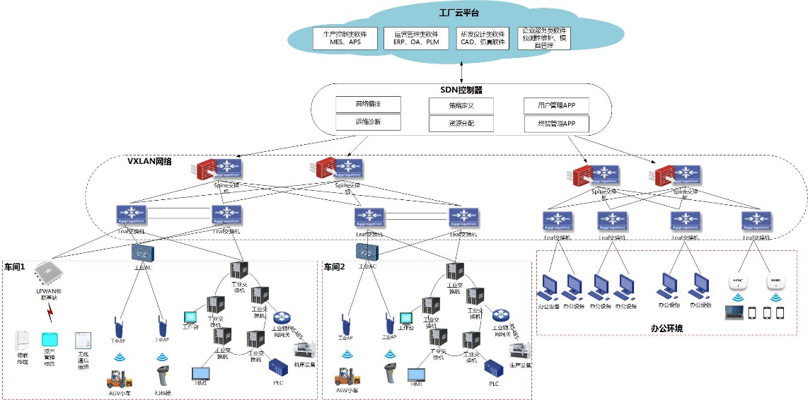 本方案旨在為制造業企業提供一套可靠的智能工廠網絡建設方案。方案利用工業物聯網、SDN、IPv6等新興技術,實現工業場景下人員、設備、物料、產品的海量互聯,為工廠實現智能生產、協同制造和柔性制造提供網絡支撐。
