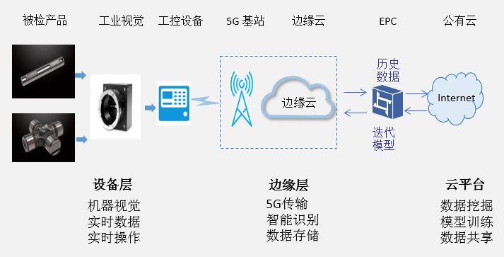 產品質量是企業的生命線,如何提高產品質量的檢測效率和精度是企業一直關注的重點。當前產品質量缺陷檢測技術主要依賴于將產品檢測圖像與預定義的缺陷類型庫進行對比分析,缺乏一定的學習能力和檢測彈性,檢測精度和效率較低。本方案通過機器視覺、5G蜂窩無線、人工智能、邊緣計算等新技術的有機結合,實現產品實時在線高精度檢測,并通過工業云平臺實現檢測模型的迭代提高和共享。