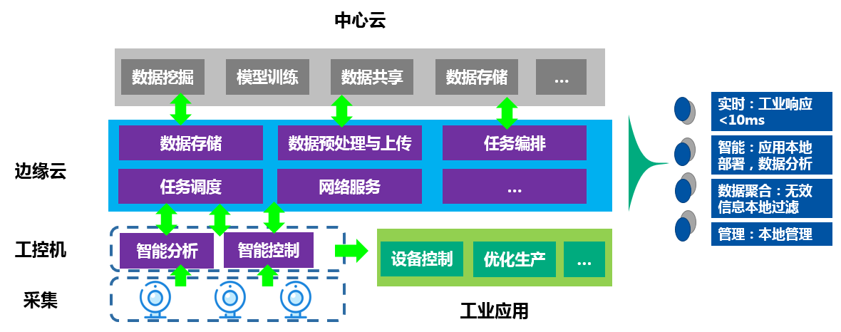 邊緣層接收來自工業視覺形成的產品圖像數據,基于人工智能算法模型進行實時分析決策,同時將數據經過聚合后上傳到中心云;同時接收經過訓練的數據處理模型進行更新,以提高檢測精度。