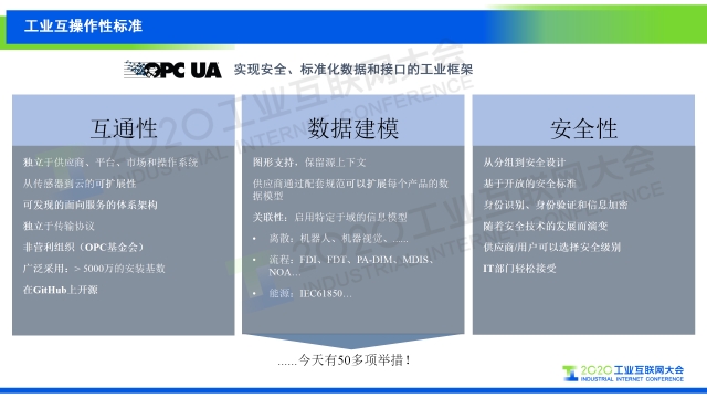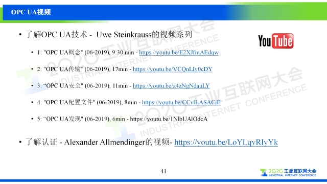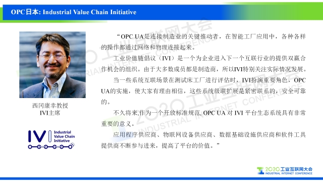 點擊下方鏈接,觀看演講視頻 專家說 “OPC UA是一個擁有良好互操作性的標準,它為用戶提供了安全和標準化的信息和接口,很多會員也好,供應商也好,終端用戶也好,使用OPC UA是因為它能夠很好的實現跨供應商的數據交互。同樣,OPC UA的開放性也可以使這些終端用戶為未來即將到來的技術實現做好準備。OPC UA通過三種方式來保障信息安全,即信息加密、身份識別、權限管理,與操作系統大致相似,所以OPC UA也被稱為是能夠提供系統級安全防護的標準。總的來說,OPC UA讓機器擁有信息模型,通過信息模型擁有自我描述的能力,從而能夠極大的減少配置工作,降低工程成本。” 以下是演講PPT 敬請閱讀
