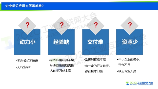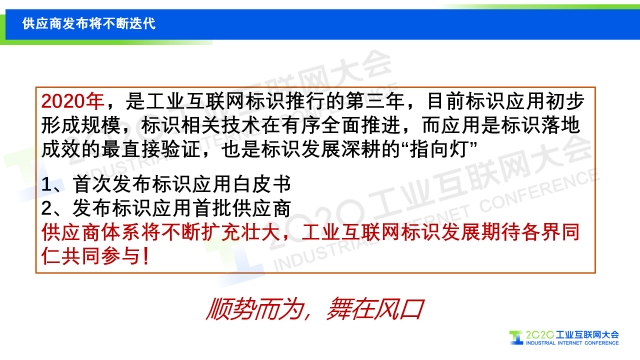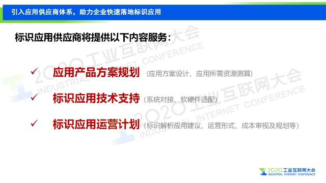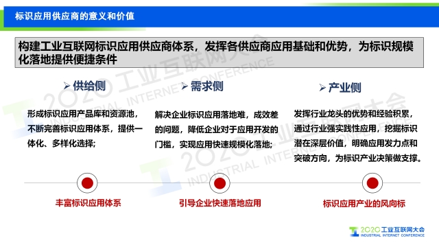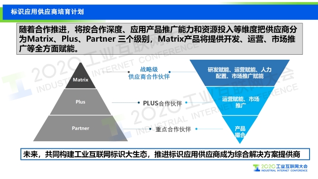 我國工業互聯網標識解析體系正逐步完善,標識應用初具規模。當前,中國信息通信研究院按照標識應用對象的不同層級構建工業互聯網標識應用體系,分析應用價值,能夠引導標識應用向更廣范圍、更大規模、更深層次發展。 中國信息通信研究院正在建立標識應用供應商體系,發揮各供應商應用基礎和優勢,為標識規模化落地提供便捷條件,將從三個方面助力企業快速落地標識應用。一是豐富標識應用體系,形成標識應用產品庫和資源池,不斷完善標識應用體系,提供一體化、多樣化選擇; 二是引導企業快速落地應用,解決企業標識應用落地難,成效差的問題,降低企業對于應用開發的門檻,實現應用快速規模化落地; 三是形成標識應用產業風向標,發揮行業龍頭的優勢和經驗積累,通過行業強實踐性應用,挖掘標識潛在深層價值,明確應用發力點和突破方向,為標識產業決策做支撐。 詳情見以下演講PPT 敬請閱讀 本次發布的工業互聯網標識應用供應商將提供應用產品方案規劃、應用方案設計、應用所需資源測算,標識應用技術支持、系統對接、軟硬件適配,標識應用運營計劃,標識解析應用建議、運營形式、成本審視及規劃等服務。 未來,中國信通院工業互聯網所將與合作伙伴共同構建工業互聯網標識生態,支持標識應用供應商成為綜合解決方案提供商,不斷壯大、完善標識供應商體系。