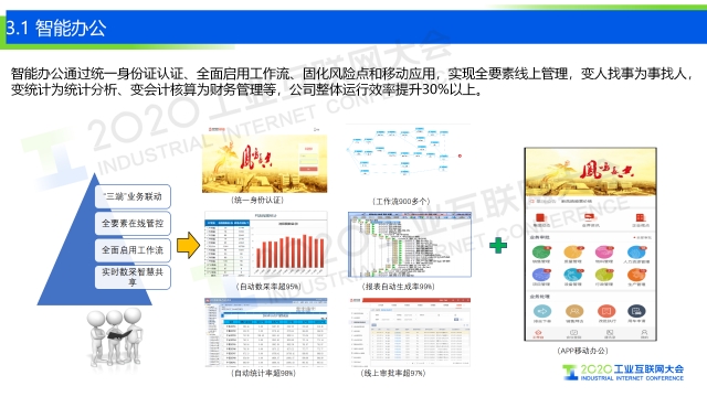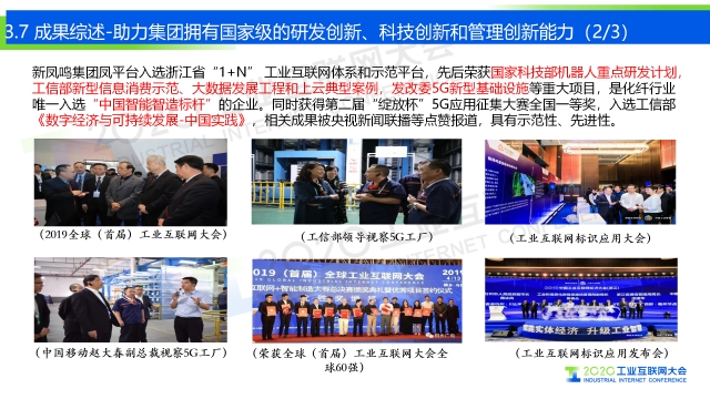 專家說 “在5G的加持下,新鳳鳴構建了集成基礎數據、實時數據、ERP、MES、大數據及商務智能、APP和標識解析于一體的工業互聯網平臺,形成智能+辦公、智能+物流、智能+銷售、智能+決策、智能+生產、智能+運營的十大應用,一體化打通集團的業務鏈、數據鏈和決策鏈,實現與內外部的互聯互通,支撐企業向上拓展產業鏈,橫向打通供應與物流鏈,向下延伸金融與服務鏈,用平臺的先進性支撐和保持我們企業高速發展、創新發展、高質量發展。” 以下是演講PPT 敬請閱讀