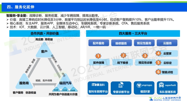 嘉賓演講視頻,請點擊下方鏈接觀看 專家說 “近幾年,商用車客戶結構和需求發生了很大變化,購車關注點也從價格向全生命周期運營成本TCO轉變。同時,個性化的定制需求逐漸增多,智能網聯技術變革,為商用車行業帶來了新的機遇,打開產品價值上升的通道,同時也為商用車市場競爭開創了新賽道。在此基礎上,福田汽車建起完善的“一云、四聯、四化”的工業互聯網頂層架構,指引福田汽車工業互聯網做到數據安全、網絡安全、平臺安全、應用安全,同時助力工業生產的過程優化、企業資源配置優化及汽車運行的智能化。未來,福田汽車將加強力度推進,將借助5G+工業互聯網模式,打造新的汽車產業生態,變革汽車產業體系,提升國產汽車品牌整體競爭力。”