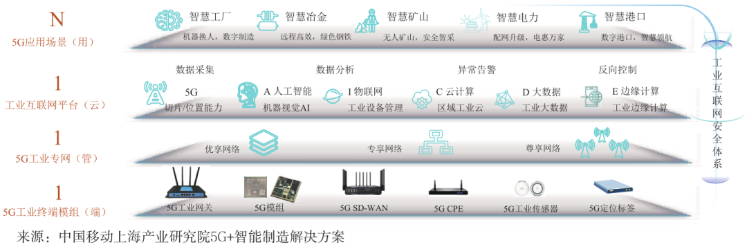 在智慧工廠建設中,通過5G數采網關、傳感器、工業通信協議等實現設備連接、聯網,5G網絡、工業Wi-Fi、現場總線等實現數據傳輸,為工業場景中萬物互聯、數據分析與處理、應用開發等功能奠定基礎,并以此實現制造業數字化、網絡化、智能化轉型升級的最終目標。