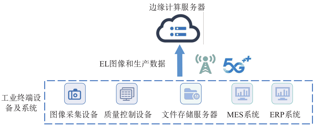 3.2.1 EL圖像數據采集基于5G智能網關的EL圖像數據采集與傳輸方法,通過5G智能網關采集生產現場的數據,借助5G專網大帶寬、廣連接、低時延的特點[9],將分散在生產現場的眾多設備、系統中的數據上傳到邊緣計算服務器。借助5G專網,EL圖像可以實時傳輸,使EL設備安裝、布局時不再拘泥于現場網線布置限制,可以隨時隨地將圖像實時傳輸到OnePower-AI質檢平臺;同時,5G網絡的大帶寬特性確保EL圖像可以高質量傳輸:快速傳輸4~8 K的EL圖像,100%保留EL圖像的細節和清晰度,提高了光伏檢測算法的識別準確率[10]。EL圖像數據采集及傳輸過程如圖2所示。