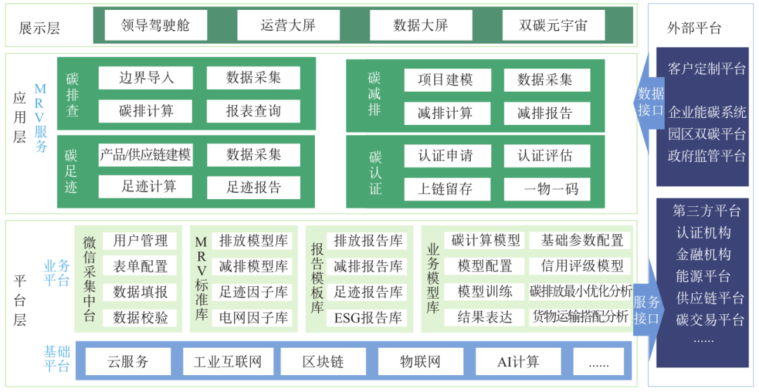 平臺層包含基礎平臺層與業務平臺層。基礎平臺層提供了云服務、物聯網、區塊鏈、大數據、人工智能(Artificial Intelligence,AI)計算等底層基礎功能;業務平臺層集成了數據采集中臺、核算標準庫、報告模板庫、業務模型庫等業務數據。應用層提供碳盤查、碳足跡、碳減排以及碳認證4個大功能模塊,為企業提供標準監測、報告及核查流程。展示層借助元宇宙、數字孿生等能力搭建領導駕駛艙、元宇宙空間,便于數據實時呈現。