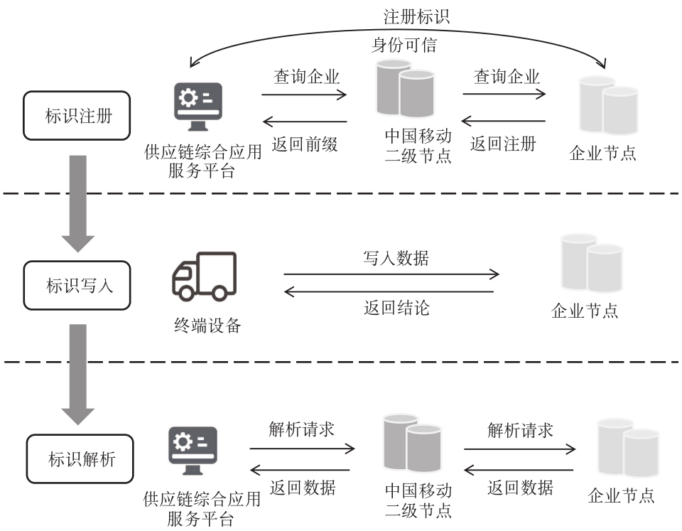 (1)標識注冊技術:雙碳綠色供應鏈綜合應用服務平臺通過中國移動標識解析二級節點獲得企業節點的前綴,結合平臺中錄入的設備或系統標識信息組合成唯一的標識信息,并發送至企業節點完成標識注冊,實現對終端采集設備及對應數據的身份可信背書。