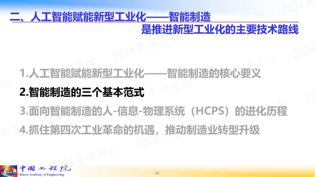 4月2日,由中國電子信息產業發展研究院(賽迪研究院)、工業和信息化部新型工業化研究中心主辦的2024賽迪論壇在京舉辦。中國工程院院士、國家制造強國建設戰略咨詢委員會主任周濟在主旨演講中表示,推進人工智能賦能新型工業化,是推進新型工業化,加快建設制造強國的技術路線。