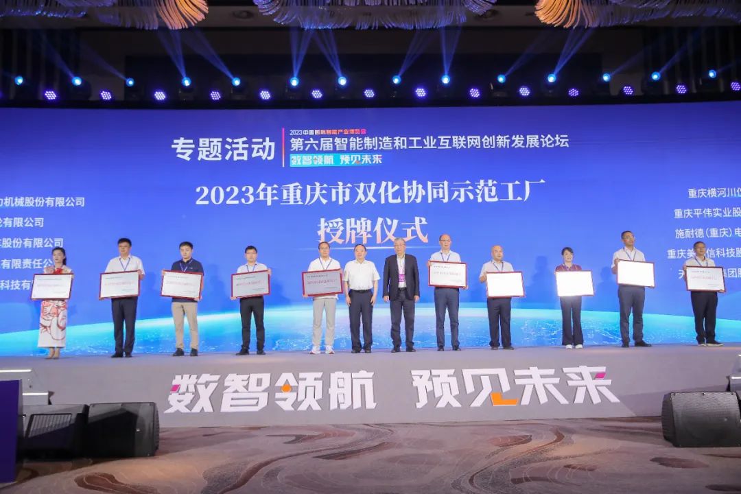 為全方位縱深推進重慶市制造業數字化綠色化“融合共生”發展,探索以數字化手段推動綠色化轉型的新路徑、新方法,引導智能工廠、綠色工廠協同發展,重慶市經濟和信息化委員會認定宗申動力、華峰重慶氨綸、長安汽車、青山工業、重慶海康威視、重慶橫河川儀、平偉實業、施耐德(重慶)電工、美利信科技和天圣制藥10家企業成為2023年重慶市雙化協同示范工廠。論壇上,中國工程院院士周濟、張平為獲評企業授牌。